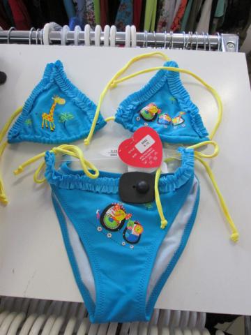 Kék alapszínű, fodorral díszített, állatmintás, kétrészes lányka fürdőruha. A felsőt nyakban, illetve háton lehet két-két különálló, szabadvégződésű, csomóval ellátott funkcionális zsinórral rögzíteni. A fürdőruha alsó mindkét oldalán –csípőrészen– szabadvégződésű, csomóval ellátott funkcionális zsinórok találhatók, melyek hossza meghaladja a 140 mm-t. A termék nyersanyag-összetétele a bevarrt címke szerint: 82% polyamid, 18% elasthan. Iktatószám: PIF-2612-2/2014.