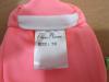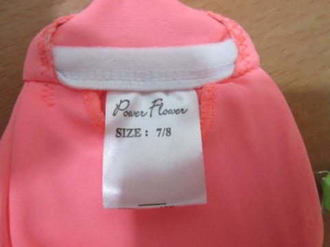 Barack színű, a felsőn zöld színű fodorral díszített kétrészes lányka fürdőruha. A felsőt a háton lehet két különálló, szabadvégződésű funkcionális pánttal rögzíteni. A bevarrt címke szerint a termék nyersanyag-összetétele: 82% poliamid és 18% elasztán. Iktatószám: PIF-2614-2/2014.