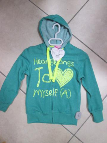 A kapucnis gyermek felső elől végig zipzáras, az alján és az ujja alján passzéval eldolgozott. Az elején nyomott felirattal és ragasztott félgyöngyökkel díszítve. A kapucniban szabadvégződésű összehúzó-szalag van, melyek végei elvarrottak. A termék nyersanyag-összetétele a bevarrt címke alapján 15% poliészter, 85% pamut. Iktatószám: PIF-2618-2/2014.