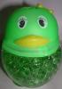 Pingvin formájú műanyag tartóban zöld színű, cukorkára hasonlító, zselés állagú, zöldalma illatú golyók.