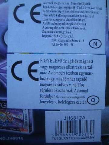 A termék nem felel meg a termékbiztonsági követelményeknek. Játék közben a gyermek hozzáférhet az apró mágnesekhez, amik lenyelve a bélrendszerben összetapadhatnak, illetve belélegezve fulladást okozhatnak. Figyelembe véve a gyermekek szokásos viselkedését, a termék előre látható használata során fennáll a bélelzáródás súlyos és a fulladásveszély nagy kockázata.